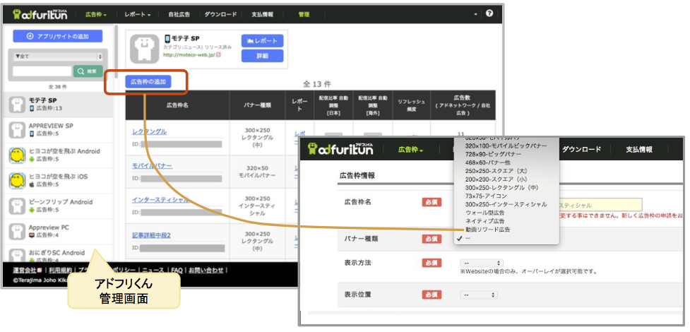 アドフリくん管理画面の[広告枠]タブ > [広告枠 追加] > [バナー種類] で「動画リワード広告」を選択します。