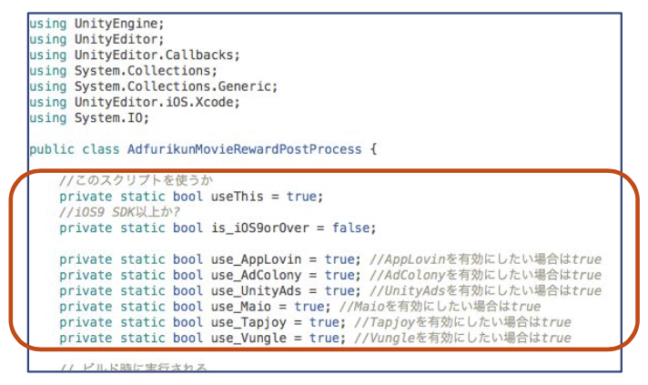デフォルトでは全アドネットワークの追加設定が有効になっていますが、アプリの容量が気になる方は、導入されるアドネットワークに応じて、Unityでのビルド前に①スクリプト内のフラグの変更と②アドネットワークSDKの削除をお願いいたします。